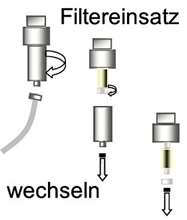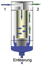 - Die gesammelten Flüssigkeitsmengen können am unteren Ende des Filters abgelassen werden.