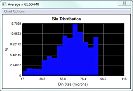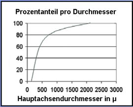 - Prozentwerte vergleichbar mit einer Siebanalyse als passierende Partikel ermittelt nach Hauptachsen oder Nebenachsenwert
